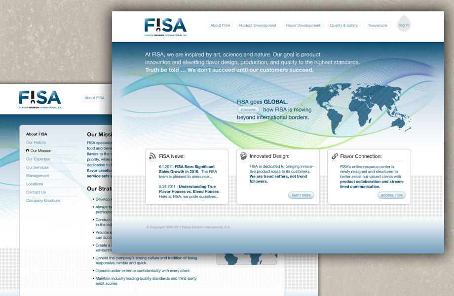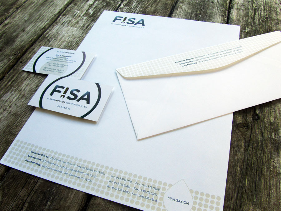 Flavor Infusion is a beverage design and manufacturing company. They make the recipes for popular beverages sold for retail. The company is expanding internationally and changed its name simply to FISA. The drop within the dot is a design element used through out the materials and is a design metaphor for their product in a global market. Graphic elements on the website indicate a balance between, science, innovation and flavor.