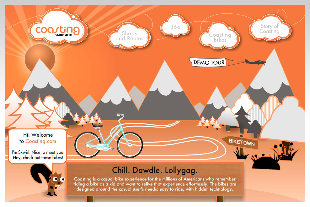 Interactive Flash website, which promoted Shimano's automatic gear system named, Coasting. My involvement included art direction, designer and programming management along with website design in Flash and Action Script programming. I also created and designed Coasting's mascot, "Skwirl". This work was done at Evolve Media where I was a Senior Art Director.